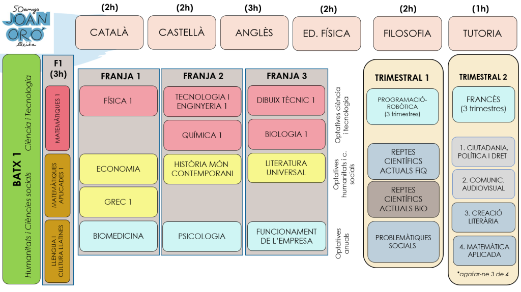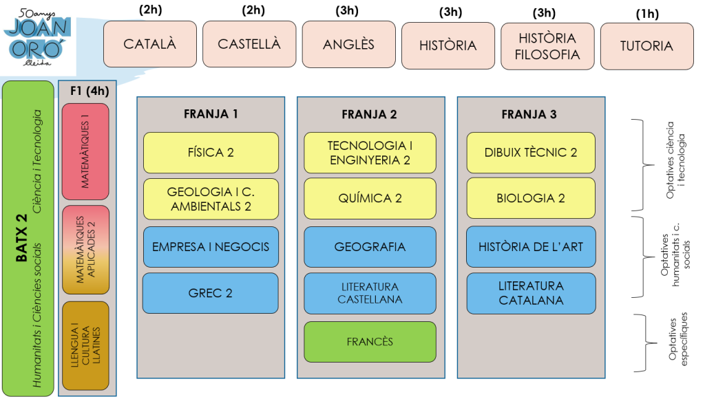 A l’Institut Joan Oró impartim el batxillerat científico-tecnològic, el social i l’humanístic. Hi ha unes assignatures comunes i unes d’optatives que depenen en gran mesura de la modalitat de batxillerat que un decideix cursar. Cal tenir en compte que la modalitat obliga a escollir, apart de l’optativa comuna de modalitat, dues assignatures més de la modalitat. En els quadres següents podeu veure la distribució.